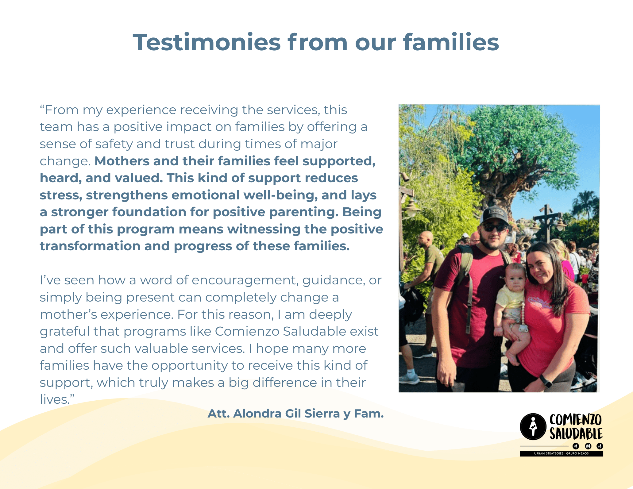 Comienzo Saludable es implementado por Urban Strategies y Grupo Nexos. Financiado por la Administración de Reccursos y Servicios de Salud (HRSA por sus siglas en ingles) a traves de la iniciativa Healthy Start.